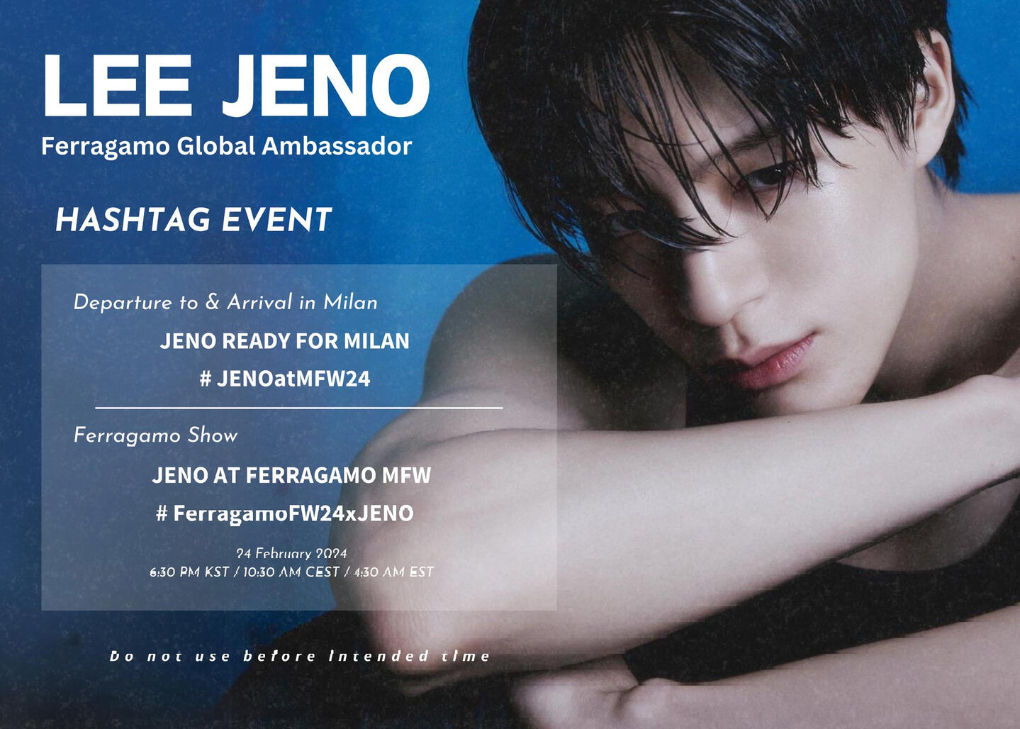 - During hashtag event, only use & add other relevant tags [#JENO + #FerragamoFW24 + @Ferragamo] in your tweets either when the template reached 100K tweets or during suitable time*
